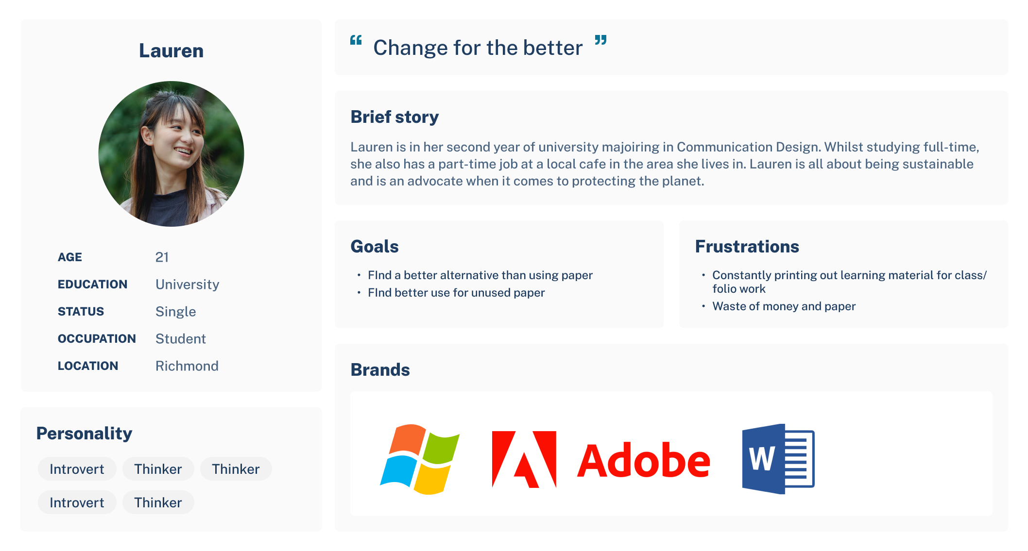 Based on responses, I have created a persona that highlights the intended user's goals, frustrations and their views on sustainability.