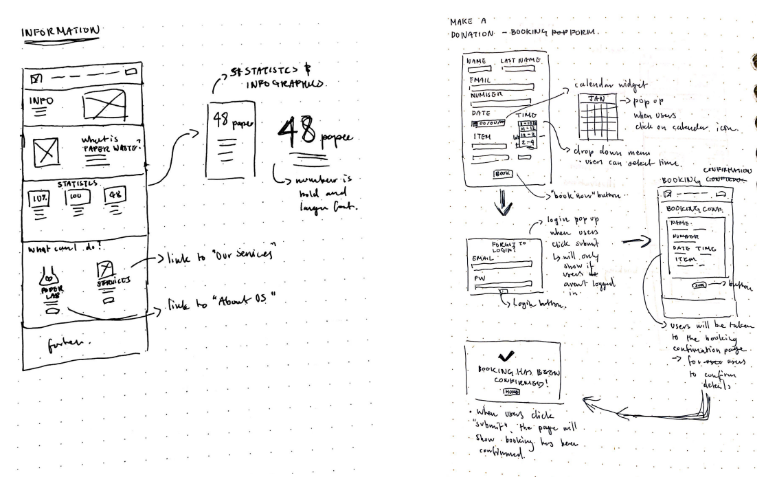 During this stage, we did 2 pages each individually and I was assigned the information and donation page. Down below are the sketches I did for the inital interation where I have noted down the types of user interactions.